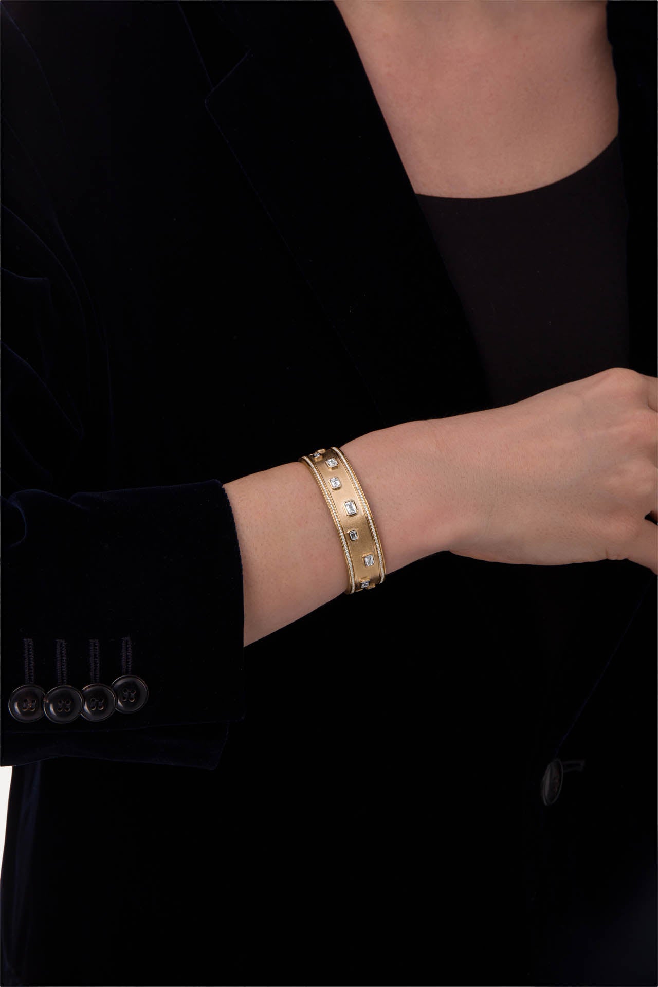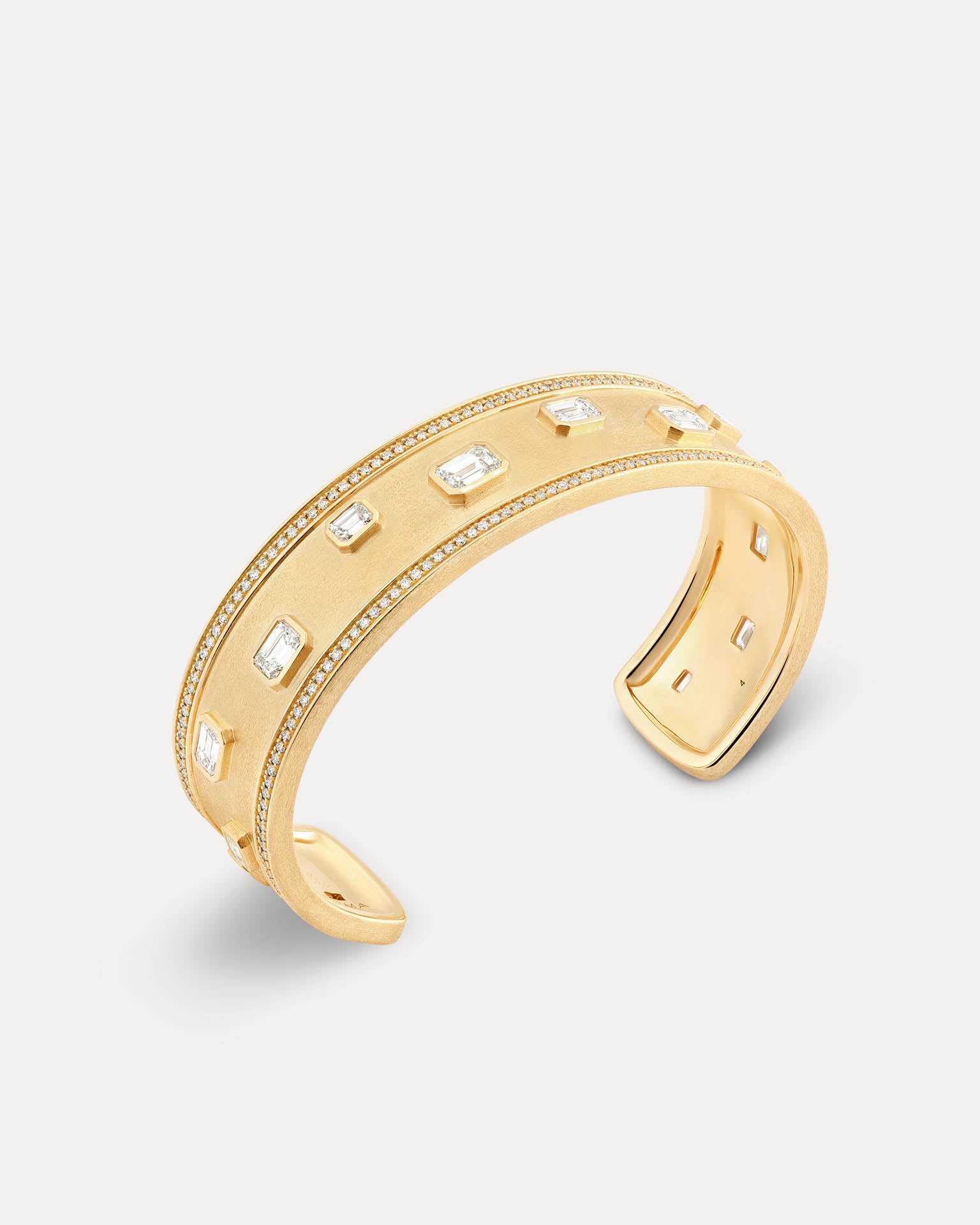 The Brushed Yellow Gold L’Armure Cuff – Classic pairs a wider architectural silhouette with a satin, semi-matte gold finish that tempers its natural luminosity. Hand-set natural diamonds add subtle brilliance, resulting in a bold yet controlled sculptural cuff.