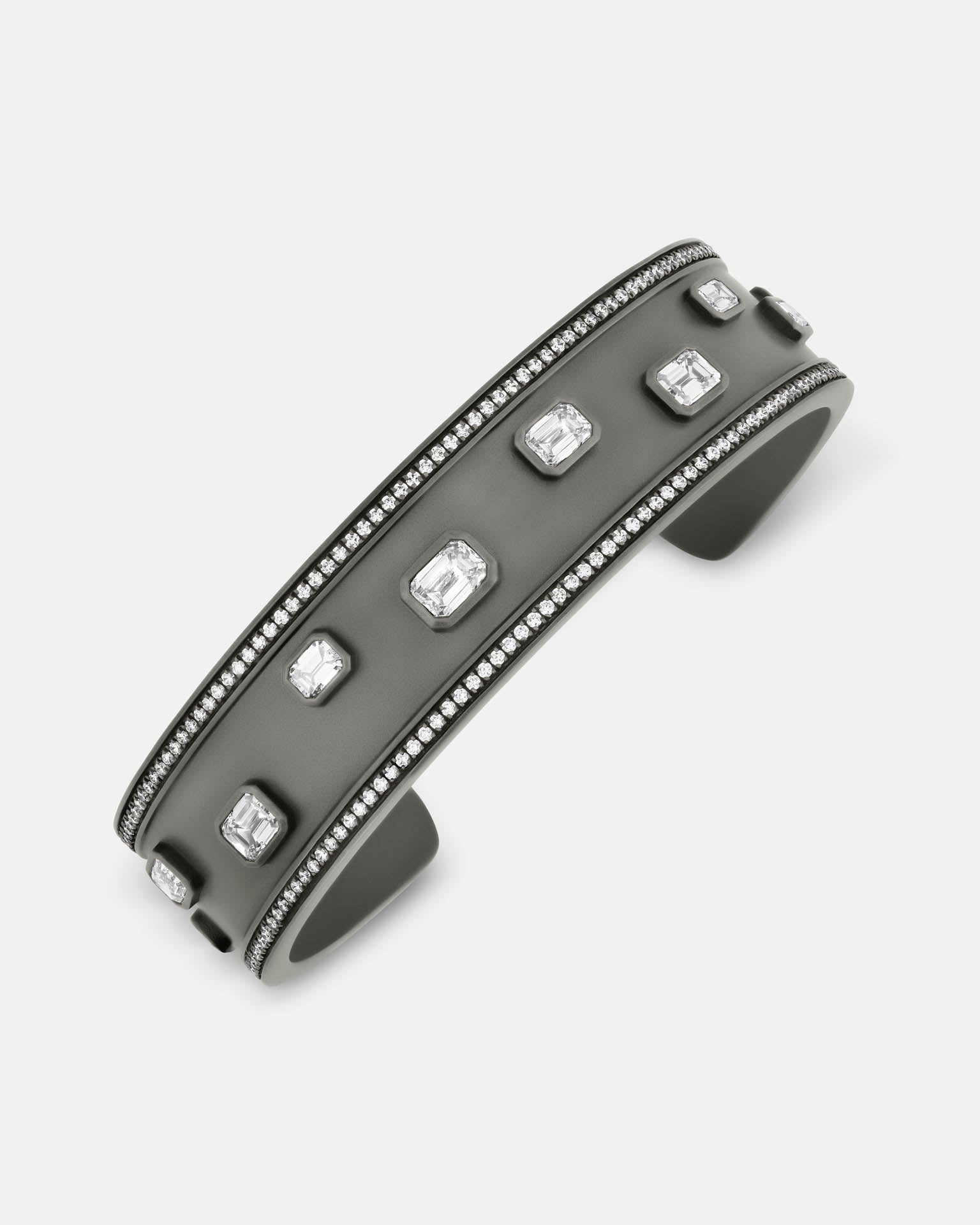 The Dark Gray Titanium L’Armure Cuff – Classic features a muted satin finish that emphasises the purity of its architectural form, articulated through a broader, more pronounced profile. Hand-set natural diamonds introduce precise points of light, creating a refined balance between strength and restraint.