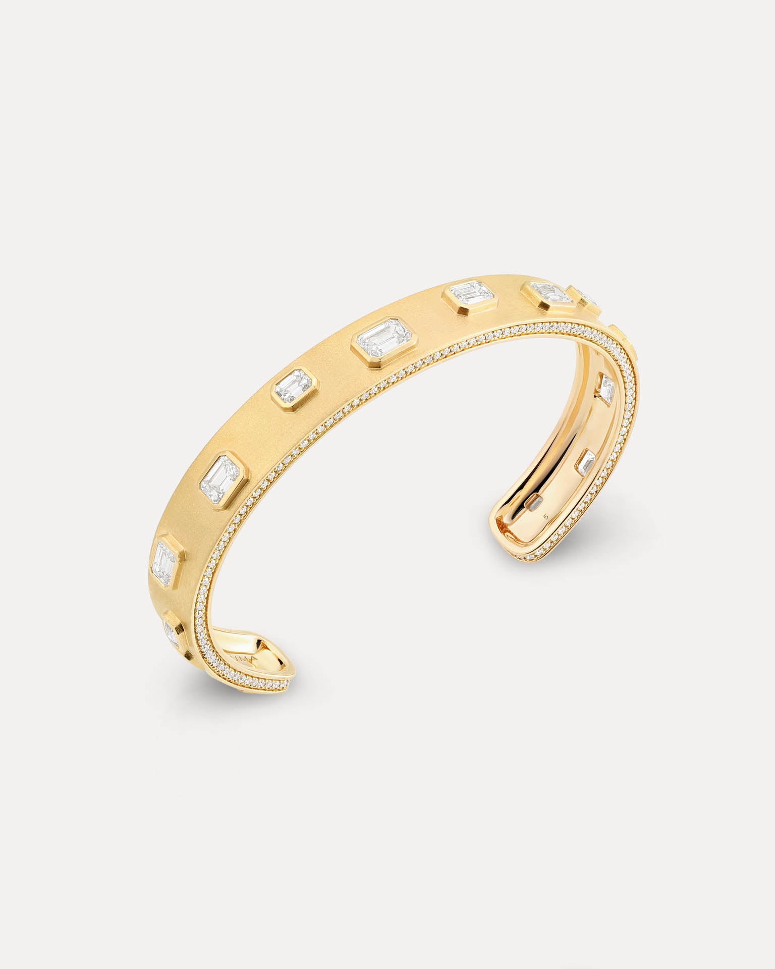 The Brushed Yellow Gold L’Armure Cuff pairs warm, brushed gold with a slim architectural silhouette. Its satin, semi-matte finish softens the gold’s natural luminosity, while hand-set natural diamonds add subtle brilliance, resulting in a sculptural cuff defined by precision and controlled elegance.