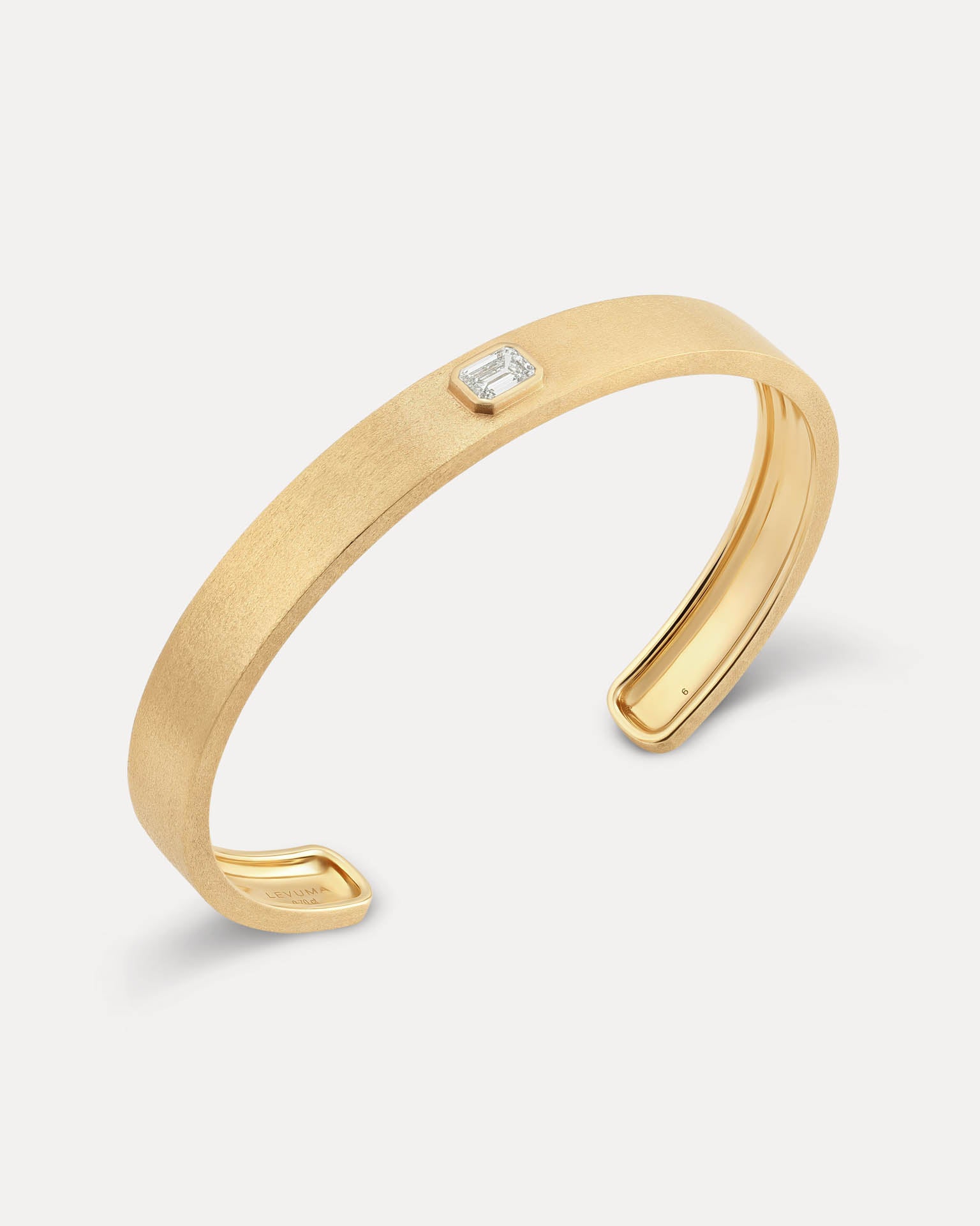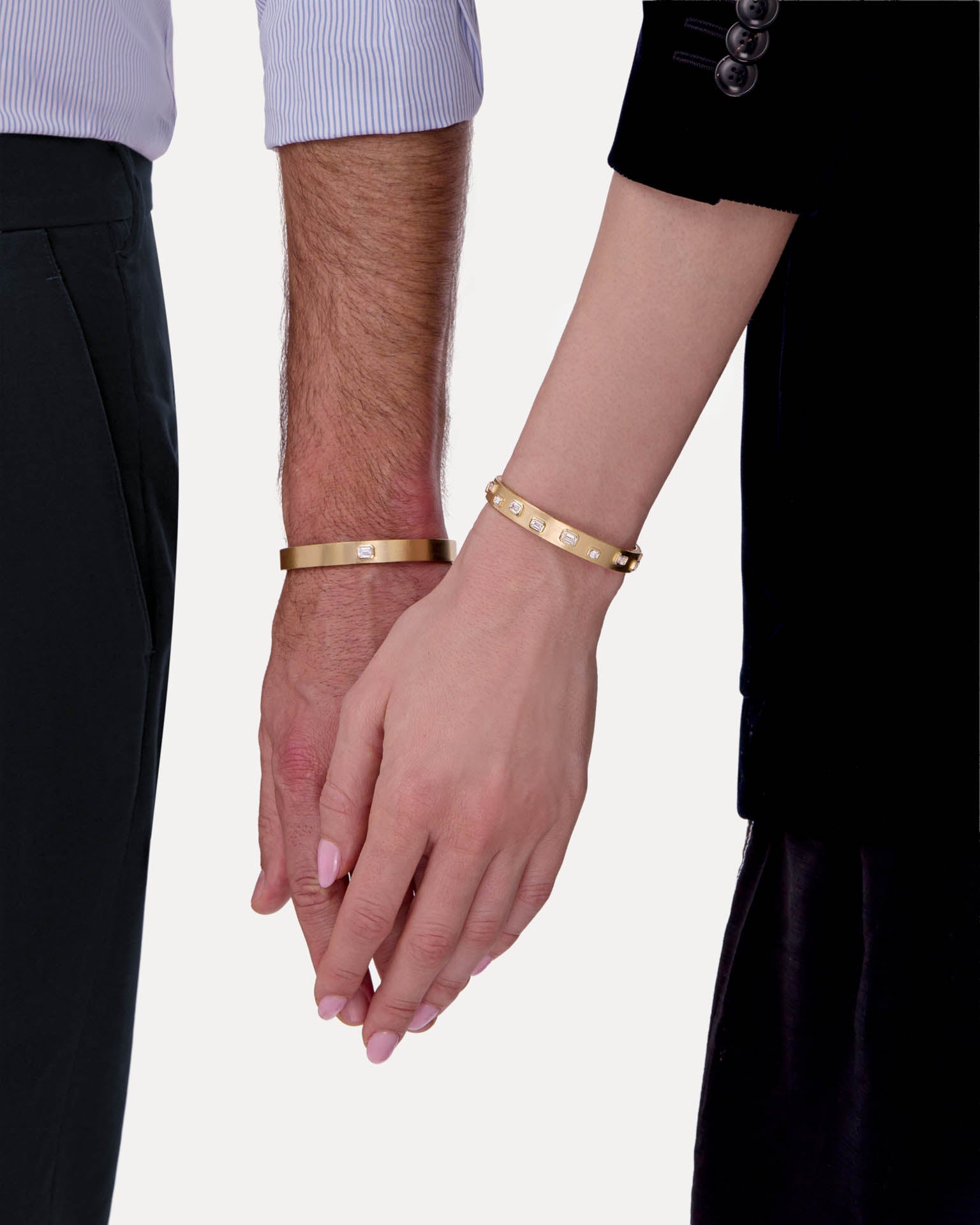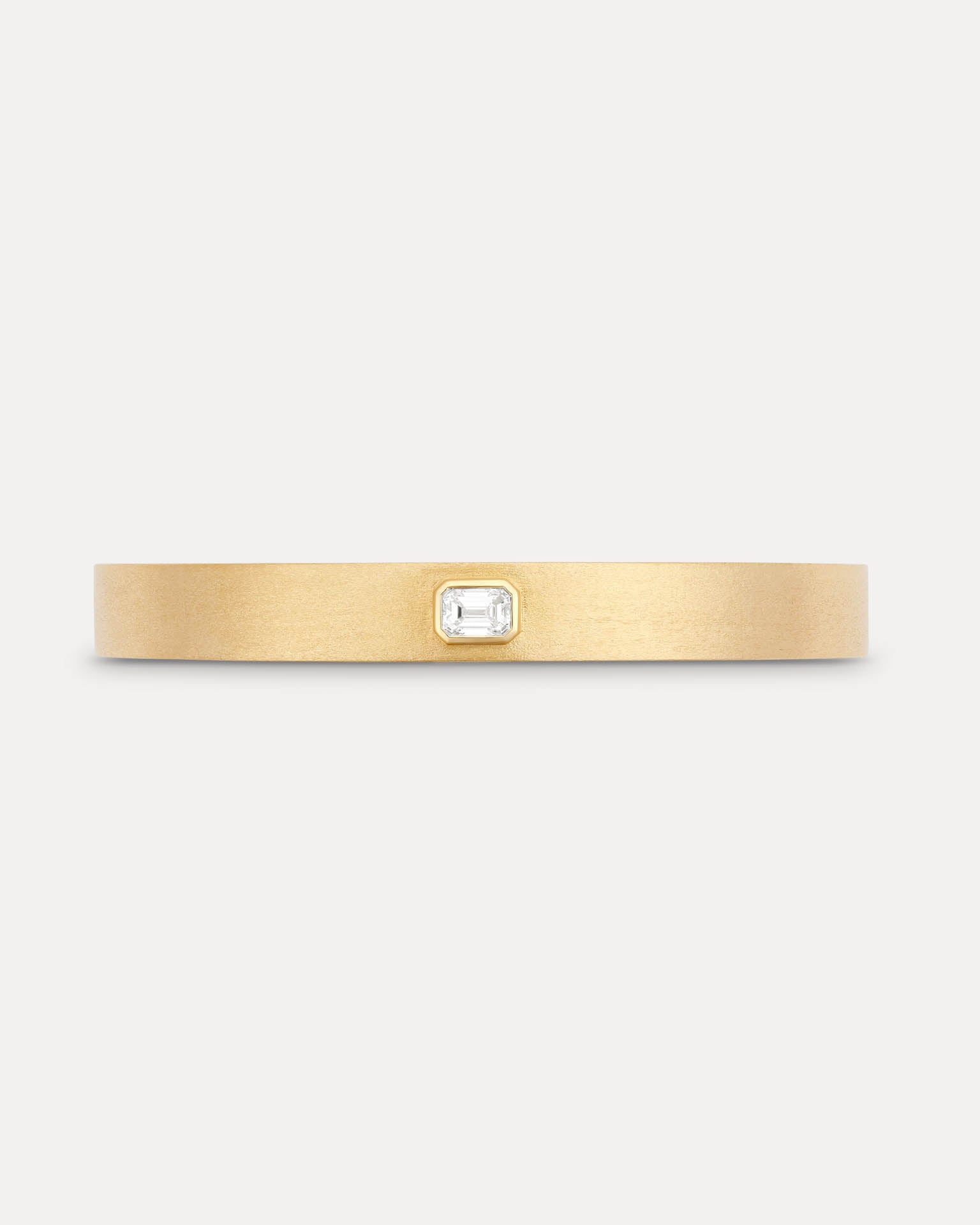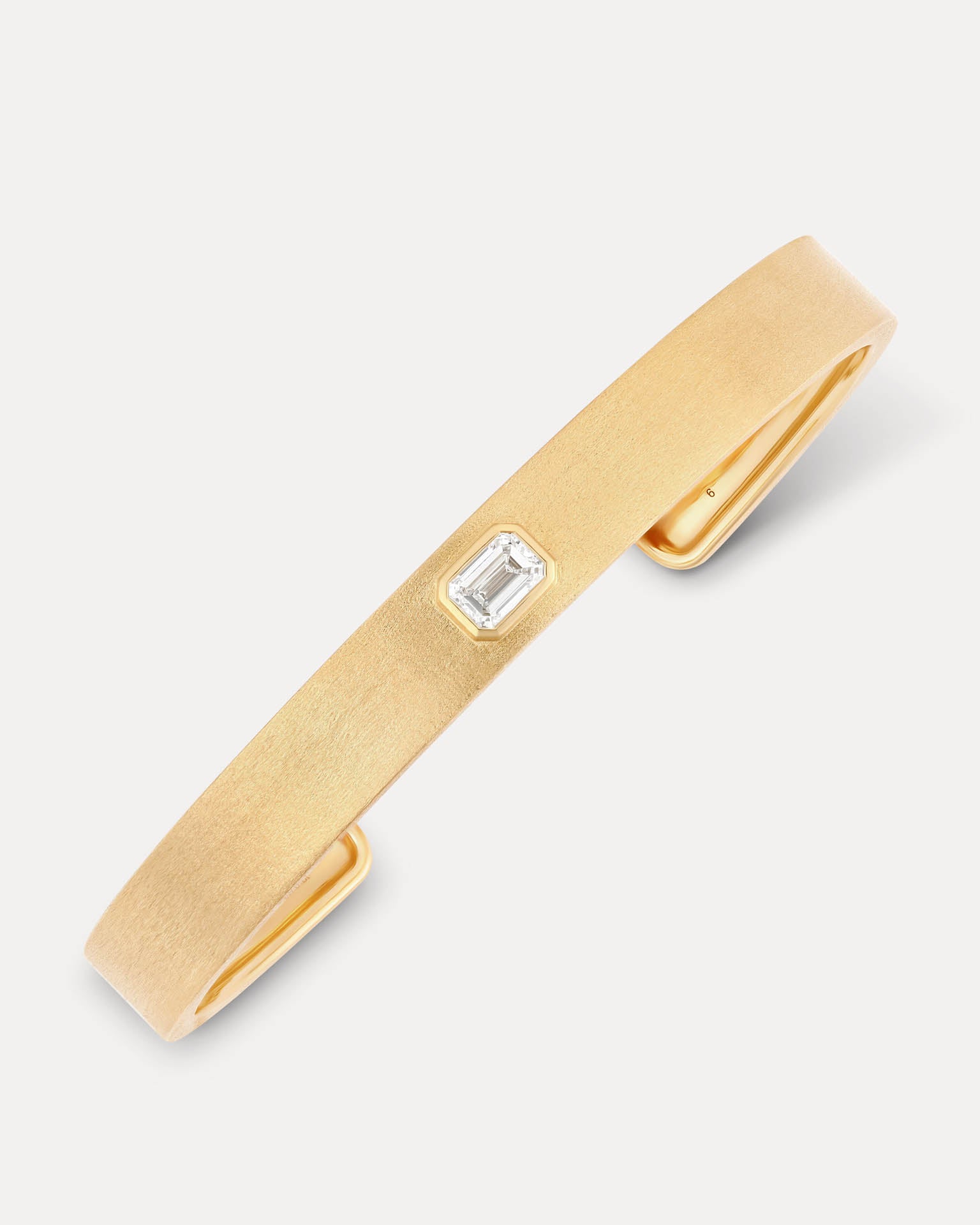 The Brushed Yellow Gold L’Armure Cuff – Solo features a satin, semi-matte finish that softens the gold’s natural luminosity while preserving the purity of its architectural form. Designed with men in mind, a single hand-set natural diamond adds restrained brilliance to this minimal sculptural cuff.